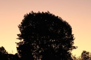 The large tree behind the field at La Salle is made dark by the sunset in the background.