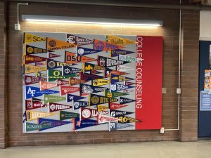 The board outside the counseling center adorned with college flags as the seniors approach college applications.