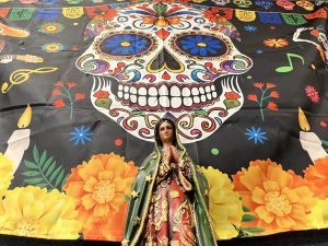 A statue of Mary stands underneath a calavera flag as part of the Dia de los Muertos display in the main hallway.
